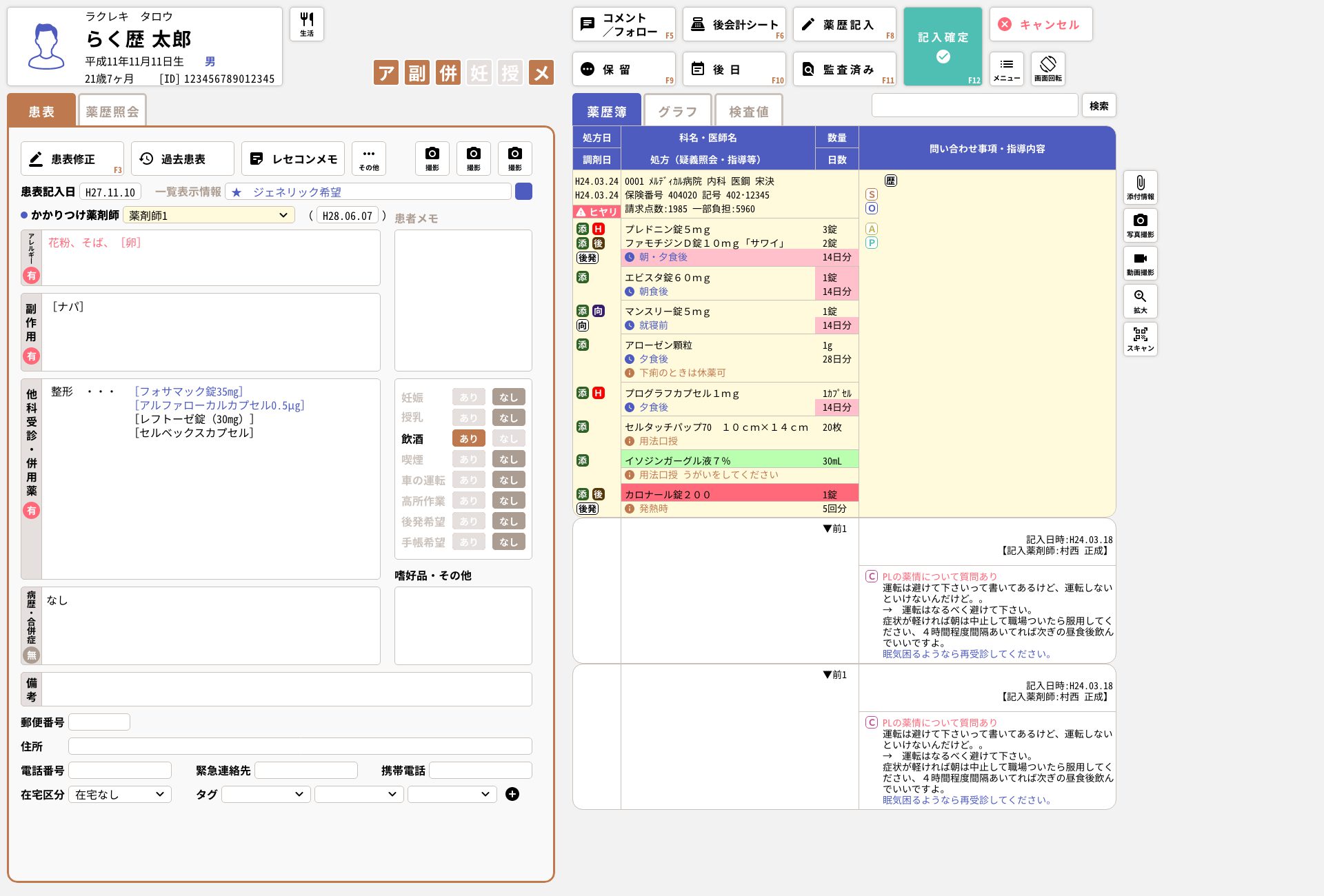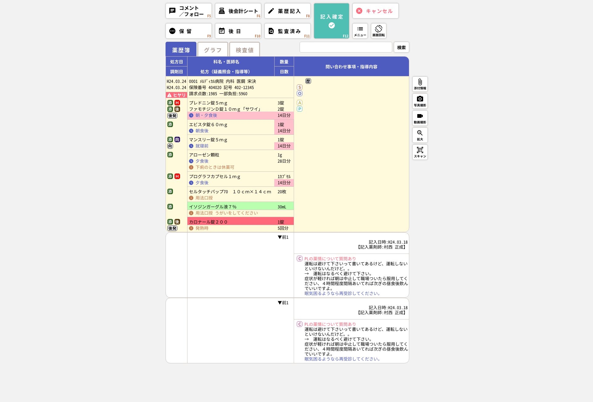 どの画面からも頭書き(患表)情報の有無が確認できますので見落とすことがありません。また、薬歴画面では今回処方との比較をわかりやすい色付けで行うため、一目で何が変更になったのかがわかります。