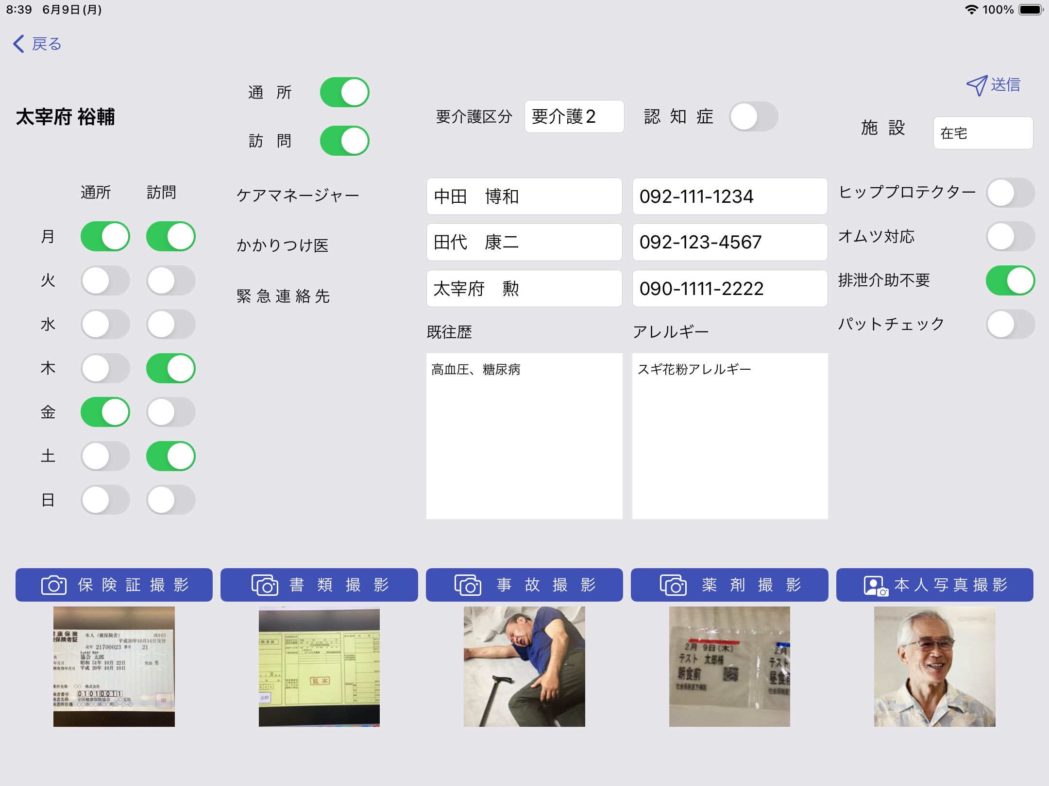 利用者様の詳細が確認できる管理機能が搭載されています。 新人の介護士さんなどにも安心して業務が行えるよう、保険証や書類、本人の写真が残せるほか、利用者様の詳細が確認できます。