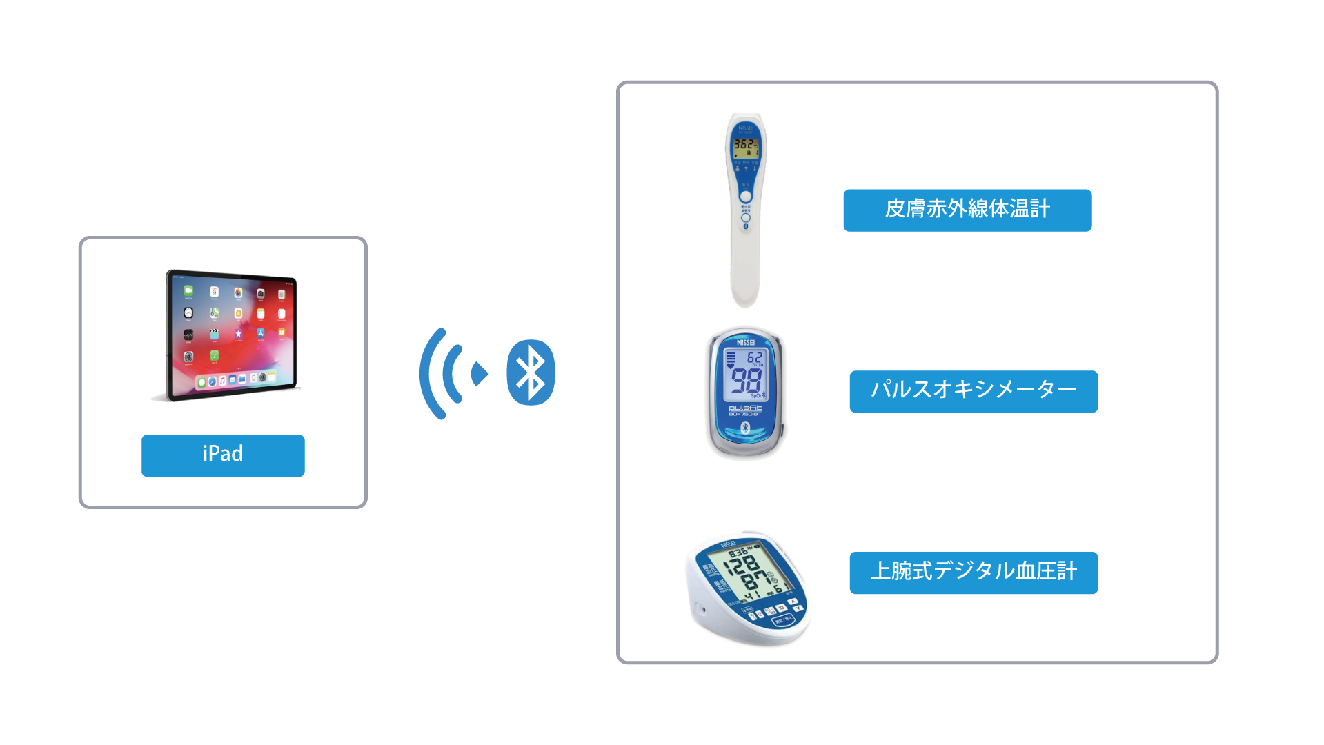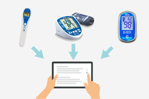 バイタルファーマではiPadとBluetooth接続された非接触型体温計をはじめ、血圧計、パルスオキシメーターの3種類のバイタル機器から測定データを自動取込。通常であれば、それぞれの機器で「データ取込」などの操作を行う必要があるのですが、3つの機器のデータを同時に取り込むことができるため、とてもスピーディーで簡単です。また、機器と連携し取り込まれることで、転記ミスを防ぎ、業務時間の短縮、負担軽減が可能となります。