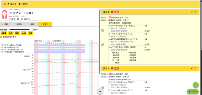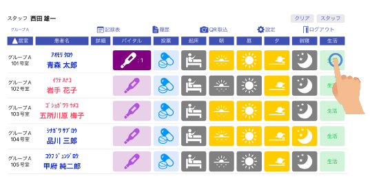 バイタルファーマには投薬管理機能が搭載しています。 利用者様の投薬ボタンをタッチすると、誤薬を防ぐために利用者様の顔写真が表示されます。また、投薬確認後は該当の服用時点をタッチすることで、簡単に服薬状況が記録されます。これにより、飲み間違いや飲み忘れを防ぐことが可能となります。