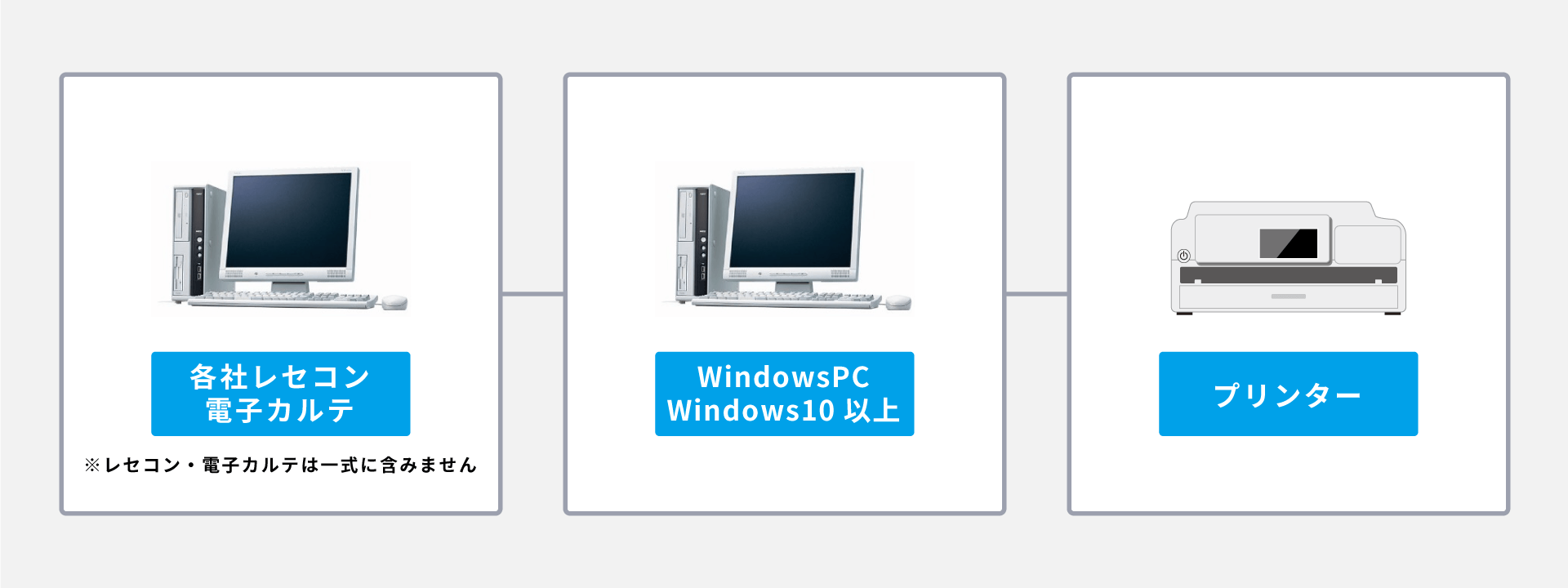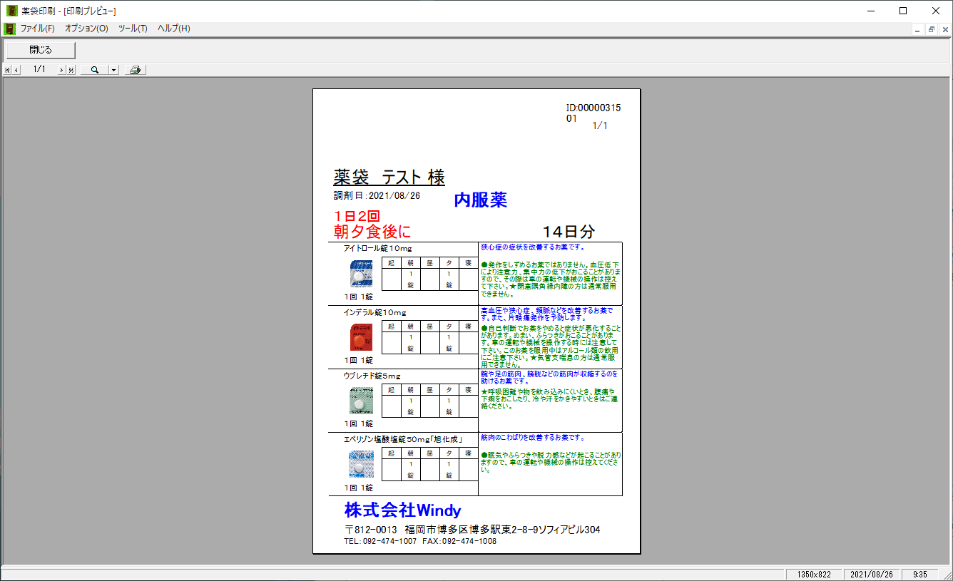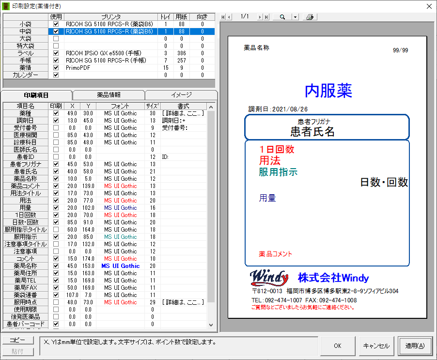 Windy薬袋印刷システムでは、初期設定を的確に行うことで、今お使いのレセコンからワンタッチで印刷が出来ます。 勿論、確認画面を停止させる事で、用途に合わせ、枚数、サイズ、薬袋の有無を任意で変更する事も可能です。