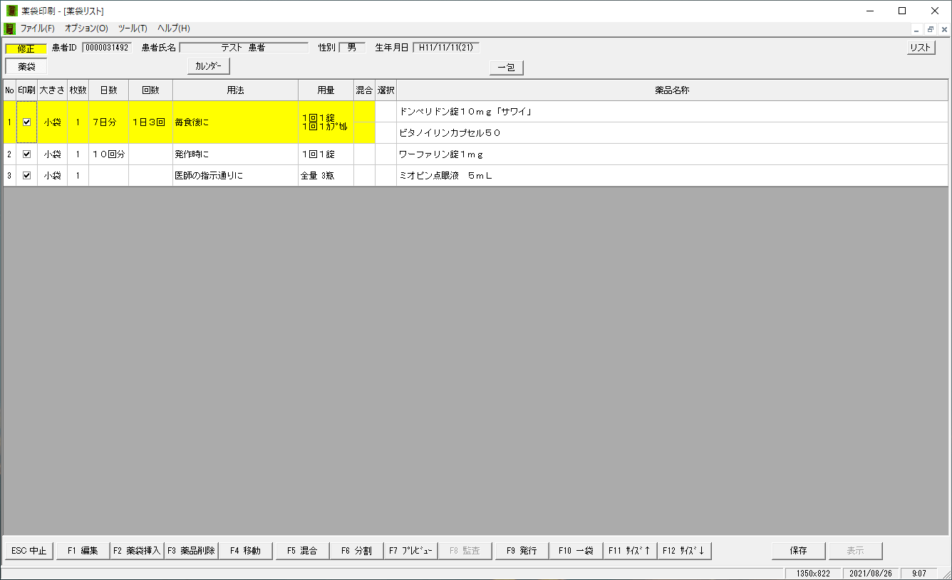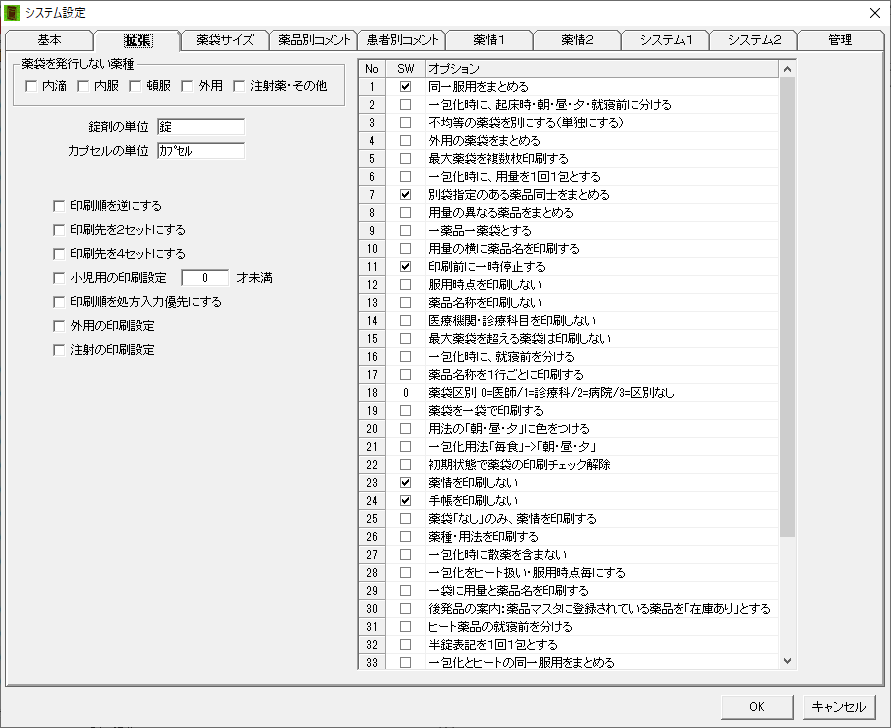 「一包化の連続巻きや反復巻き」長期で出された漢方薬などが薬袋一枚では収まりきれない時に2枚目発行を自動で判断」 「不均等指示や糖尿病薬などを別薬袋に」薬品コメントを印刷」などさまざまな薬局の使用に対応した設定を行えます。